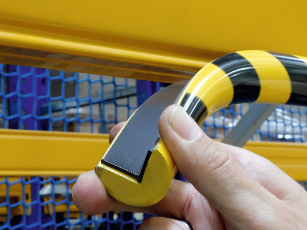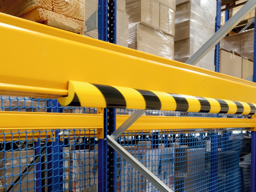 ochranný rohový profil, magnetická ochrana rohov, žlto-čierny bezpečnostný profil, flexibilný roh z polyuretánu, ochrana stien a hrán, bezpečnostný roh do skladu, rohový chránič na stroje a regály, rohový profil RAL 1003 9004