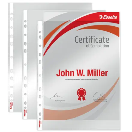 Prémiový euroobal značky Esselte určený na časté a reprezentatívne použitie. Vďaka vysokej hrúbke 105 mikrónov z hladkej recyklovateľnej PP fólie poskytuje maximálnu ochranu dokumentov formátu A4. Otvorené zhora, s univerzálnym 11-dierovým eurodierovaním vhodným do všetkých bežných typov šanónov. Ideálne riešenie pre spoľahlivú archiváciu aj profesionálnu prezentáciu.