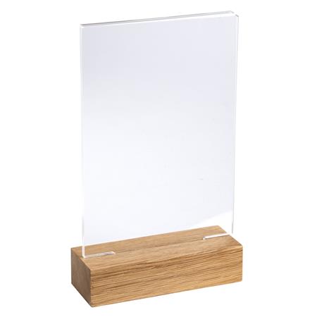 Exacompta A6 display stand, acrylic document holder with oak base, photo stand, leaflet holder, menu holder, clear acrylic display, table brochure stand, office display stand, vertical photo display.
