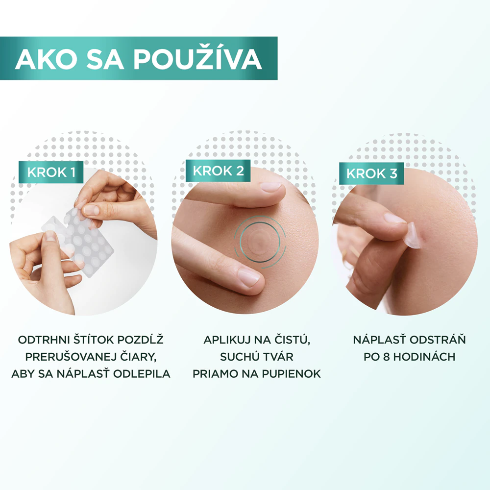 Aplikujte ráno alebo večer na čistú a suchú pleť pred použitím séra alebo krému. Roztrhnite štítok pozdĺž prerušovanej čiary, opatrne odlepte náplasť a priložte ju priamo na pupienok alebo inú nedokonalosť. Jemne pritlačte a nechajte pôsobiť aspoň 8 hodín, potom ju zložte.