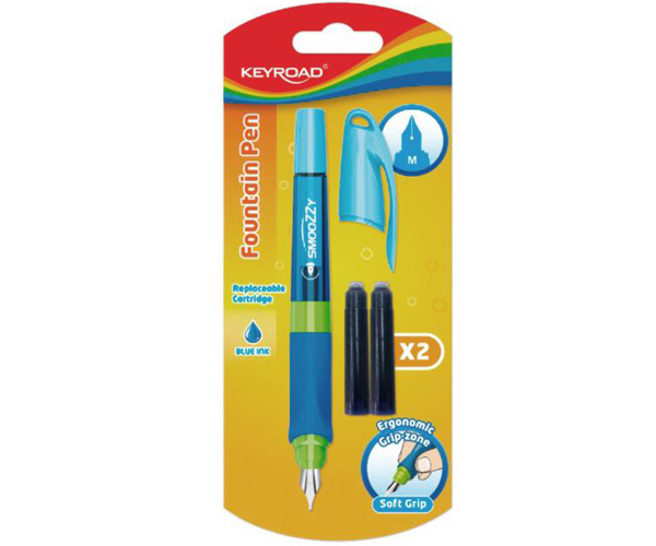 Písacie plniace pero KEYROAD Smozzy, ideálne na učenie písania v škole aj doma. Má ergonomický, pogumovaný profil rukoväte, vhodné pre pravákov aj ľavákov. Vysoko kvalitný hrot z nehrdzavejúcej ocele hrúbka čiary písania: 0,7 mm. Umývateľný modrý atrament. Balenie: blister. Farba: mix farieb.