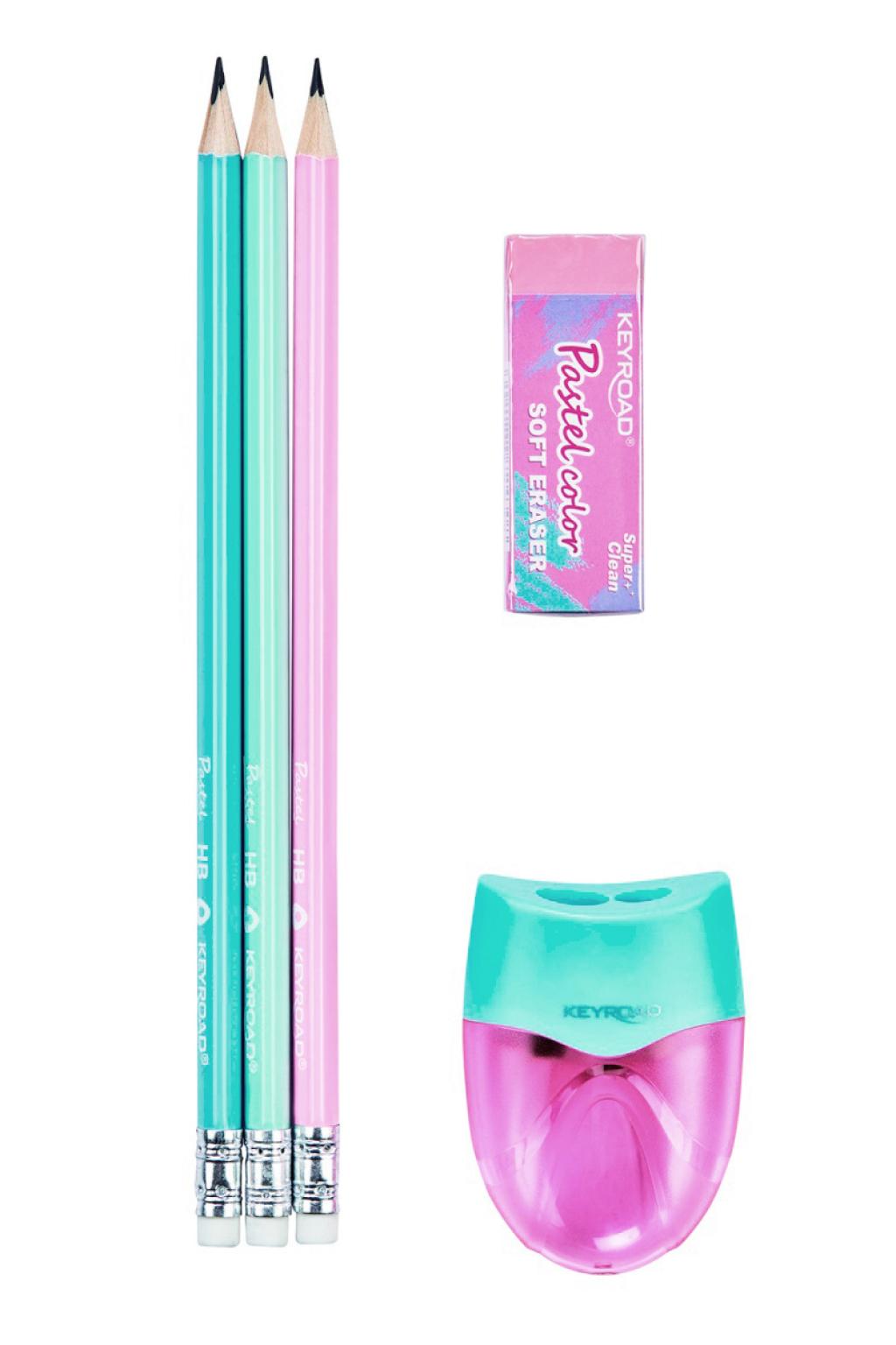 Súprava pastelových grafitových ceruziek KEYROAD, 5 ks: grafitová ceruzka trojuholníková, s gumou 3 ks, strúhadlo plastové dvojité, s nádobkou 1 ks, mäkká guma 1 ks. Balenie: blister. Farba: mix farieb.