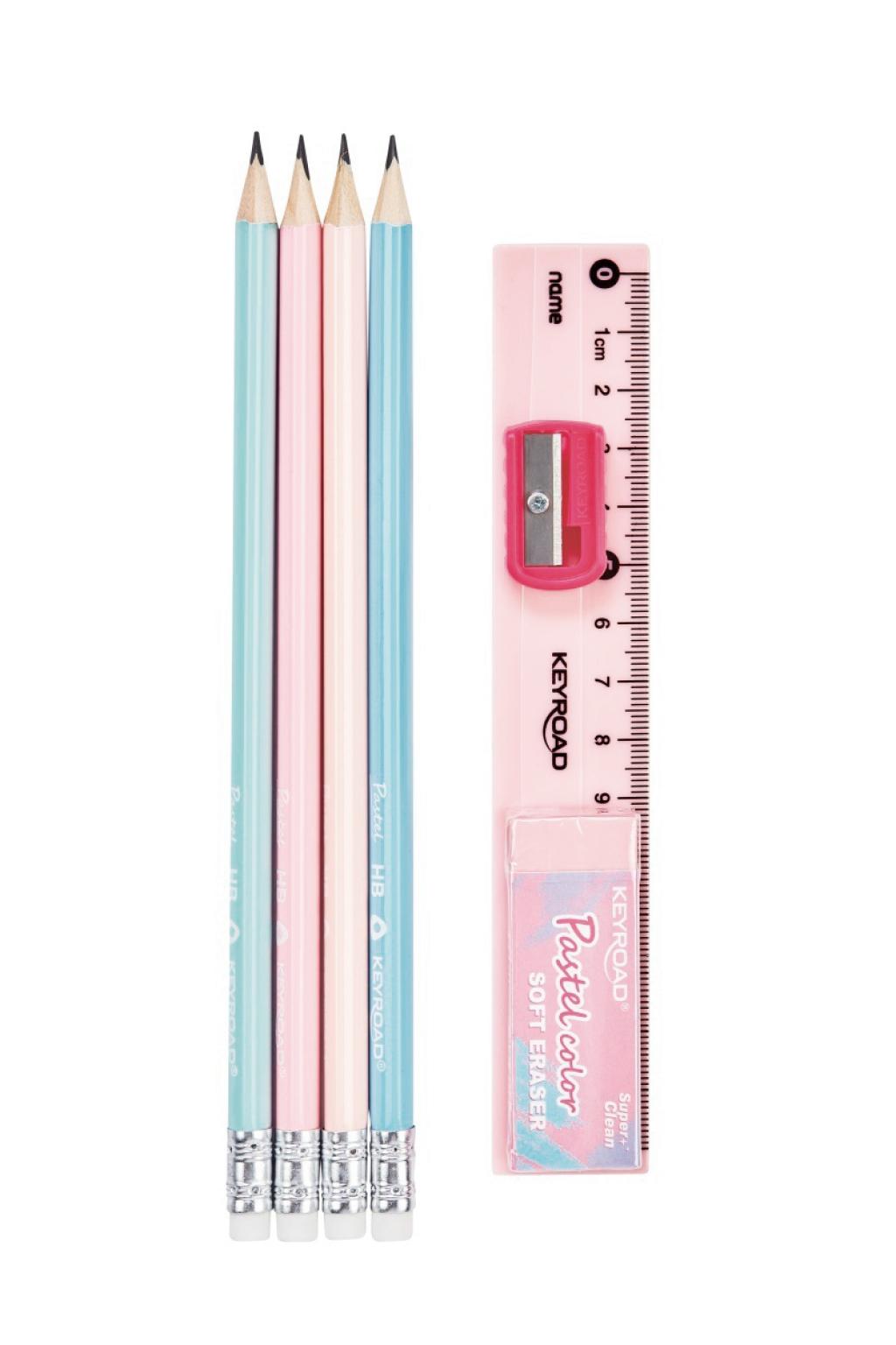 Súprava školských pomôcok KEYROAD, 7 ks: pastelová grafitová ceruzka, trojuholníková, s gumou - 4 ks, strúhadlo plastové 1 ks, mäkká guma 1 ks, plastové pravítko 20 cm 1 ks. Balenie: blister. Farba: mix farieb.