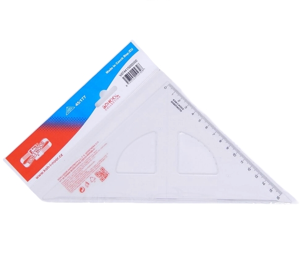Trojuholník 45/177 s kolmicou je vyrobený z číreho priehľadného polystyrénu a je určený na presné rysovanie a technické kreslenie. Dĺžková stupnica je naražená technológiou horúcej ražby, ktorá zaručuje presnosť až 0,2 % dĺžky. Trojuholník je navyše vybavený ryskou pre konštruovanie kolmíc, čo z neho robí praktický nástroj pre školské, kancelárske aj profesionálne použitie. Dodáva sa v polyetylénovom sáčku s eurozávesom.