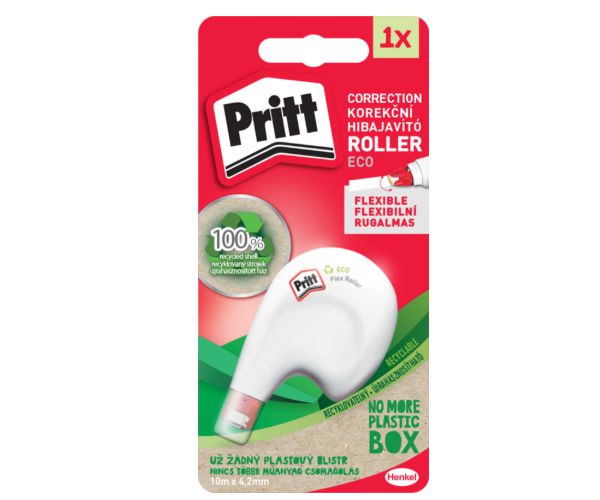 PRITT korekčný Eco Flex roller 4,2 mm x 10 m ekologický korektor vyrobený zo 100 % recyklovaných plastov jednorazový korekčný roller na suchú korekciu okamžite prepisovateľný PUSH & PULL systém pre ľavákov ergonomický tvar flexibilná špička hladká aplikácia bez trhania a špinenia pásky školské a kancelárske potreby eco friendly correction tape PRITT