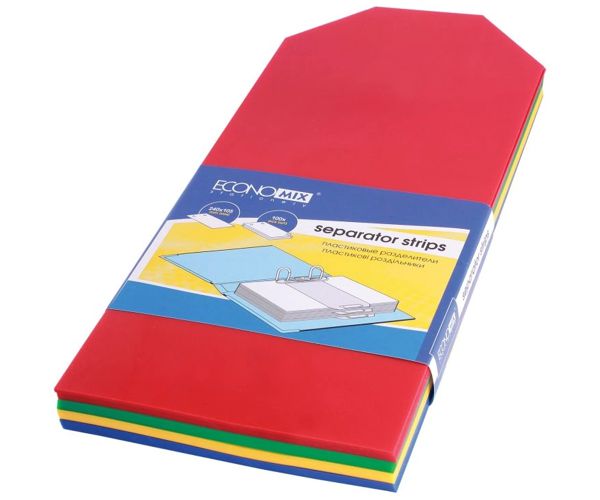 ECONOMIX separator strips 240x105 mm, polypropylene divider strips, 100 pack, red blue green yellow, binder dividers strips, office filing accessories, document separators PP, Economix E30810 plastic dividers.