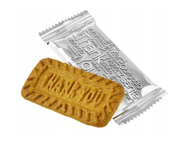 RIOBA Thank You sú tradičné karamelové sušienky so škoricou, každá s reliéfnym nápisom „THANK YOU“. V praktickom gastro balení nájdete 200 jednotlivo balených kúskov po 6 g, spolu 1,2 kg – perfektný doplnok ku espressu, čaju, na konferenčný stôl či hotelovú recepciu.