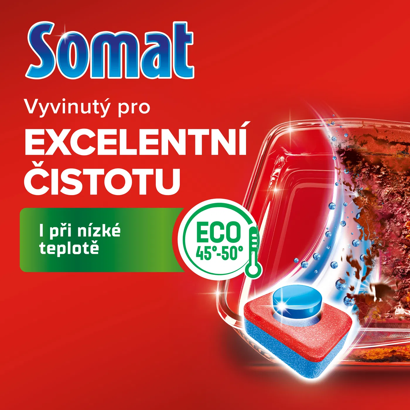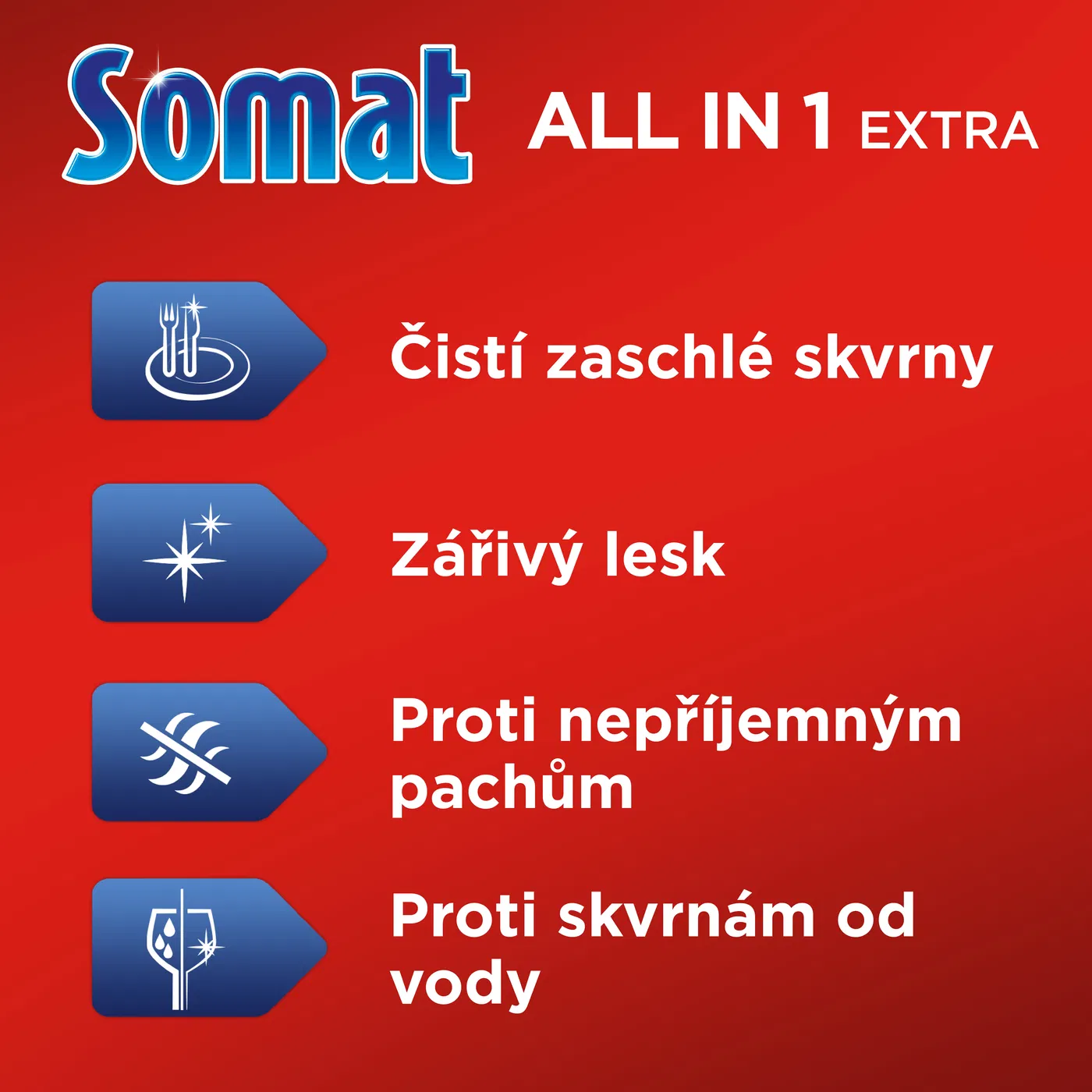 Tablety do umývačky riadu Somat All-in-1 Extra neutralizujú zápach a zaručujú dokonale čistý riad aj pri krátkych a ekologických programoch s nízkou teplotou. Ich účinné a rýchlo pôsobiace zloženie si poradí so zaschnutými zvyškami jedla aj so škvrnami od kávy či čaju.