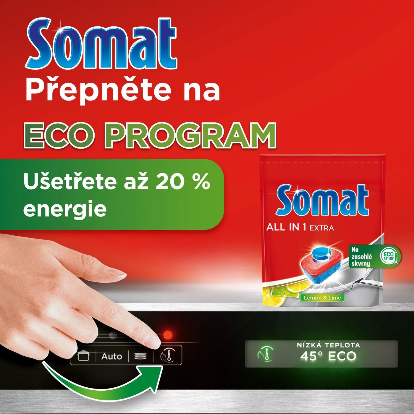tablety do umývačky Somat, Somat All-in-1 Extra, tablety do umývačky s citrónovou vôňou, čistenie riadu v eco programe, umývacie tablety s vôňou limetky, neutralizácia zápachu v umývačke, žiarivý lesk riadu, šetrné tablety pre krátky cyklus, tablety na umývanie riadu bez škvŕn, ochrana riadu proti korózii