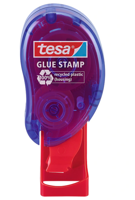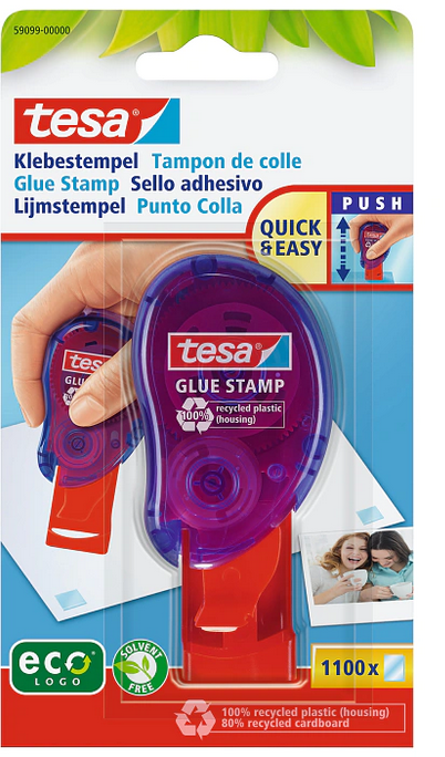 tesa® glue stamp je rýchly a šikovný spôsob, ako trvalo prilepiť fotografie, poznámky, účtenky či iné ľahké objekty na papier alebo kartón. Vhodný do kancelárie aj na domáce kreatívne projekty – a navyše je vyrobený zo 100 % recyklovaného plastu!